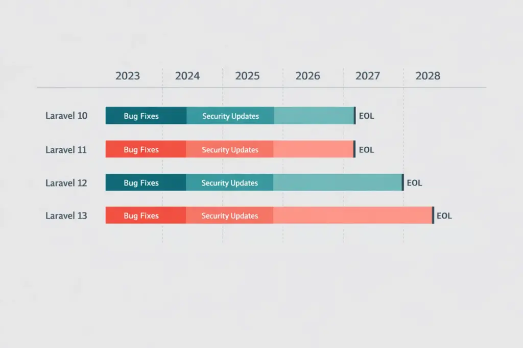 Bug fixes continue until August 13, 2026. Security fixes continue until February 24, 2027. If you are on Laravel 12 today, you still have time — but Laravel 13 should already be part of your plan.